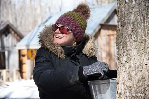 “Family always comes first, business second,” she says. “Raising our children in this business is a great opportunity for them. Children learn more from our actions than our words. We involve them in actual production as much as we safely can. They help tap trees and they help fill the wood trolley when we are boiling sap, they help refill our roadside porch store. They hang out with us in the woods when we are repairing lines and doing maintenance.”